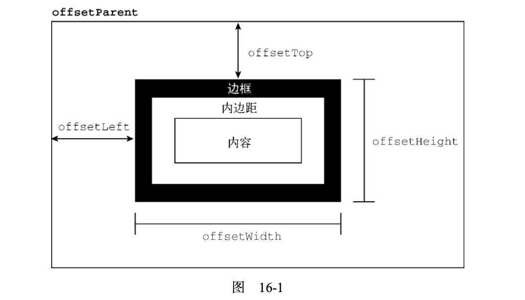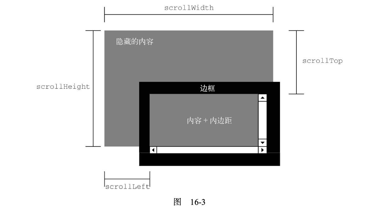 scrollWidth,没有滚动条出现时,元素内容的总宽度。 图 16-3 展示了这些属性的含义。