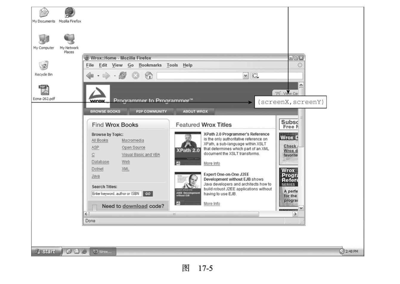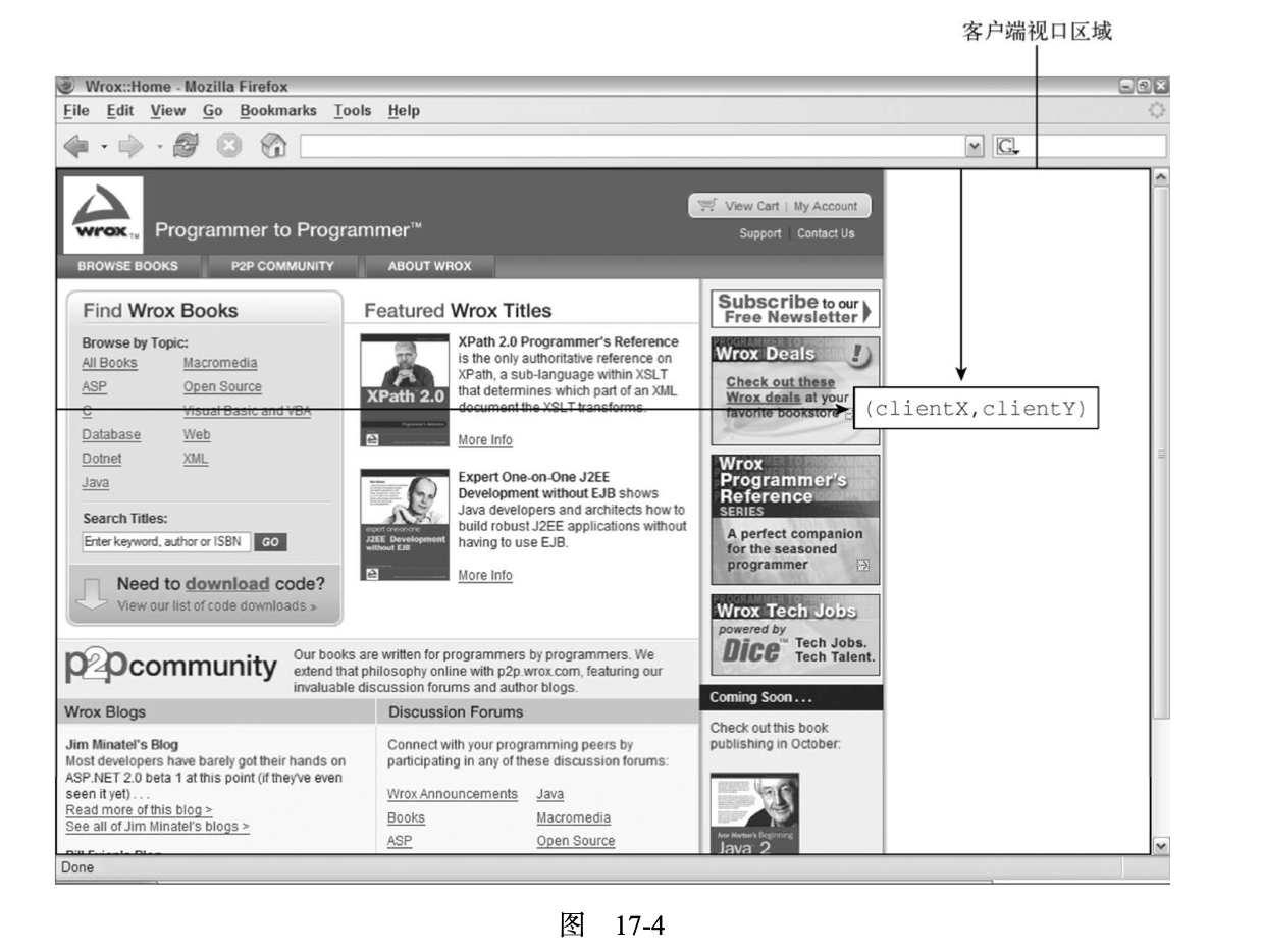 IE8及更早版本没有在event对象上暴露页面坐标。不过,可以通过客户端坐标和滚动信息计算出 来。滚动信息可以从 document.body(混杂模式)或 document.documentElement(标准模式)的 scrollLeft 和 scrollTop 属性获取。计算过程如下所示: