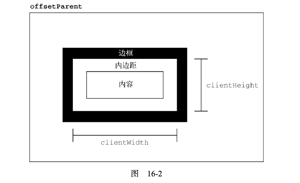 元素的客户端尺寸(client dimensions)包含元素内容及其内边距所占用的空间。客户端尺寸只有两 个相关属性:clientWidth 和 clientHeight。其中,clientWidth 是内容区宽度加左、右内边距宽 度,clientHeight 是内容区高度加上、下内边距高度。图 16-2 形象地展示了这两个属性。