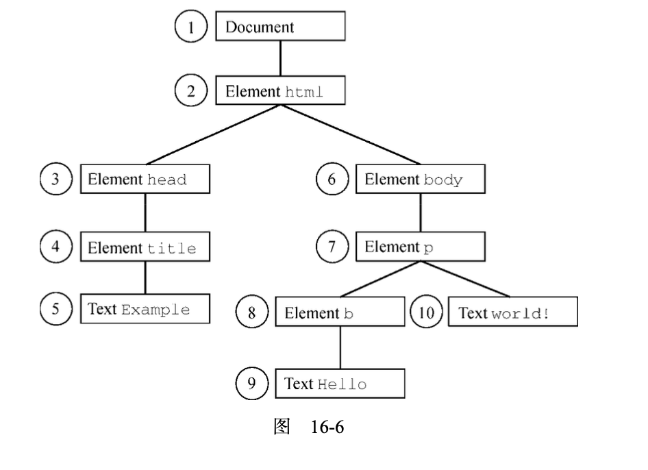 其中的任何节点都可以成为遍历的根节点。比如,假设以<body>元素作为遍历的根节点,那么接 下来是<p>元素、<b>元素和两个文本节点(都是<body>元素的后代)。但这个遍历不会到达<html>元 素、<head>元素,或者其他不属于<body>元素子树的元素。而以 document 为根节点的遍历,则可以 访问到文档中的所有节点。图 16-6 展示了以 document 为根节点的深度优先遍历。