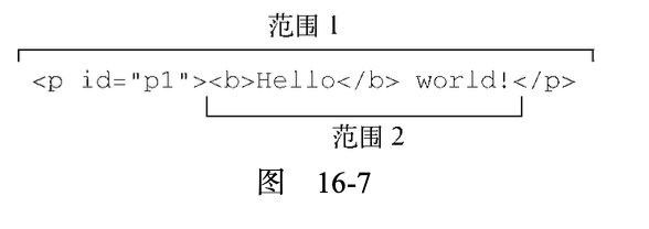 例子中的这两个范围包含文档的不同部分。range1 包含<p>元素及其所有后代,而 range2 包含 <b>元素、文本节点"Hello"和文本节点" world!",如图 16-7 所示。