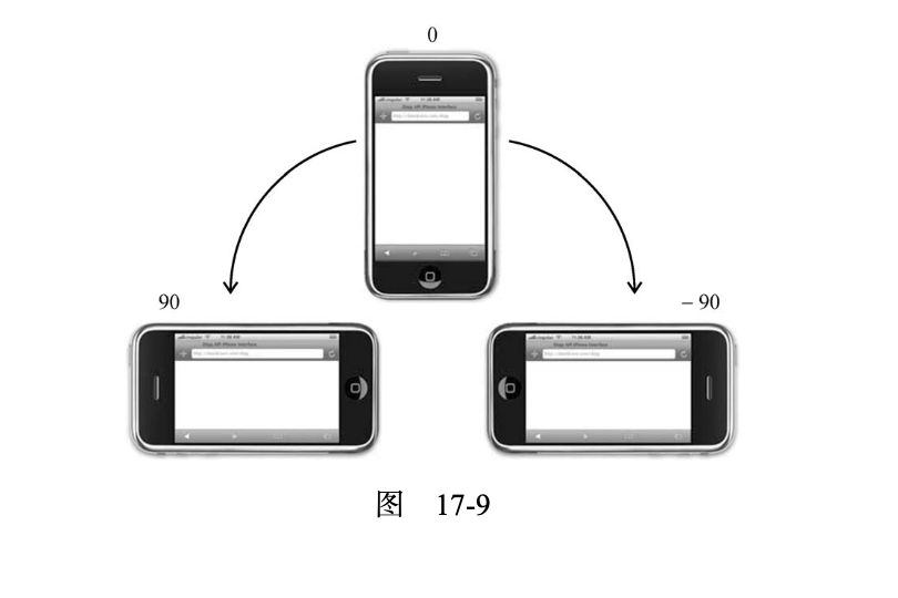 果公司在移动 Safari 浏览器上创造了 orientationchange 事件,以方便开发者判断用户的设备 是处于垂直模式还是水平模式。移动 Safari 在 window 上暴露了 window.orientation 属性,它有以 下 3 种值之一:0 表示垂直模式,90 表示左转水平模式(主屏幕键在右侧),–90 表示右转水平模式(主 屏幕键在左)。虽然相关文档也提及设备倒置后的值为 180,但设备本身至今还不支持。图 17-9 展示了 window.orientation 属性的各种值。